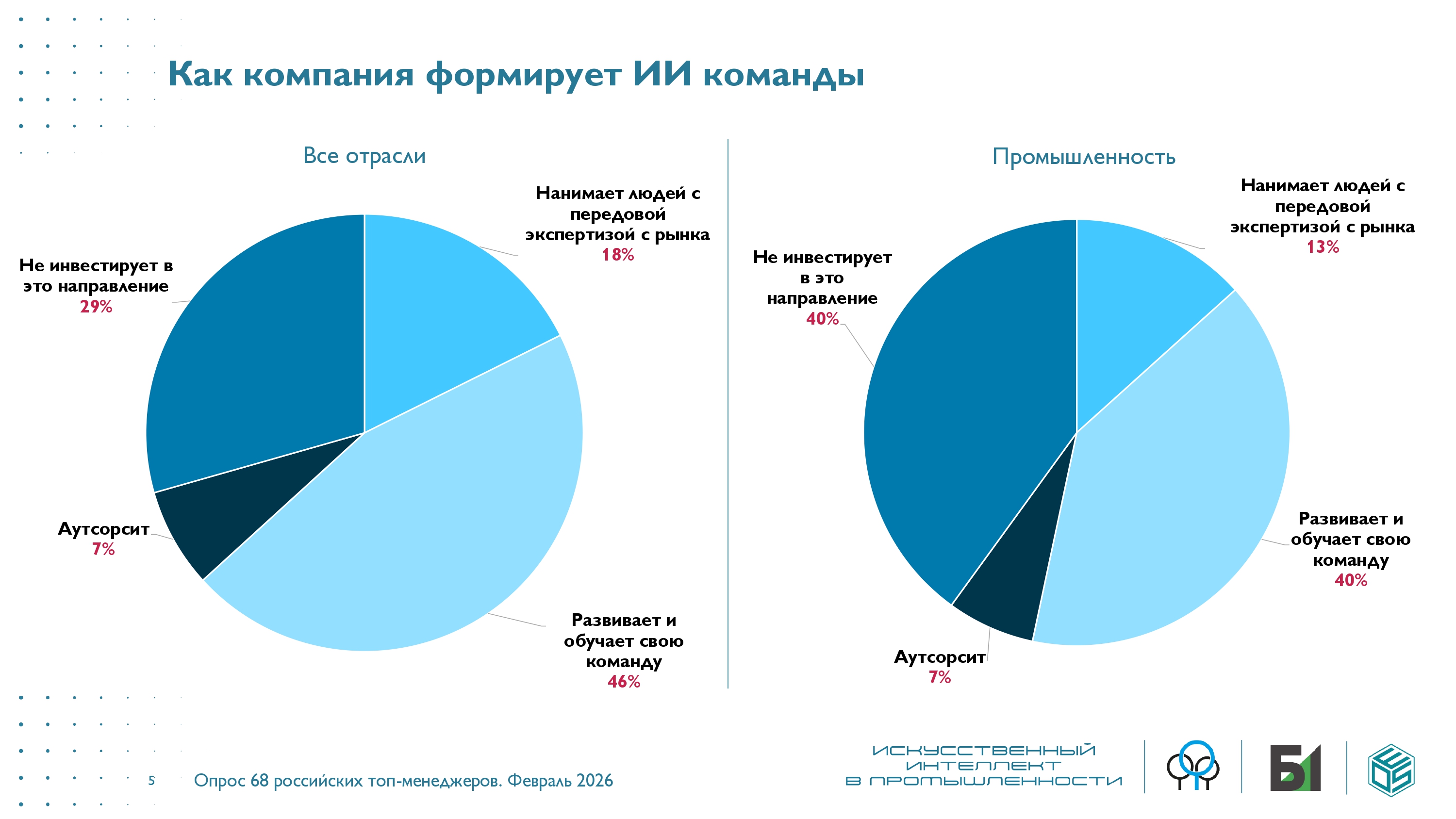 Развитием внутренних ИИ-команд занимаются 46% опрошенных компаний, 29% не инвестируют в это направление, и только 18% компаний уже нанимают сотрудников с передовой экспертизой с рынка. При этом 7% респондентов отметили, что их компании передают эту функцию на аутсорсинг.
