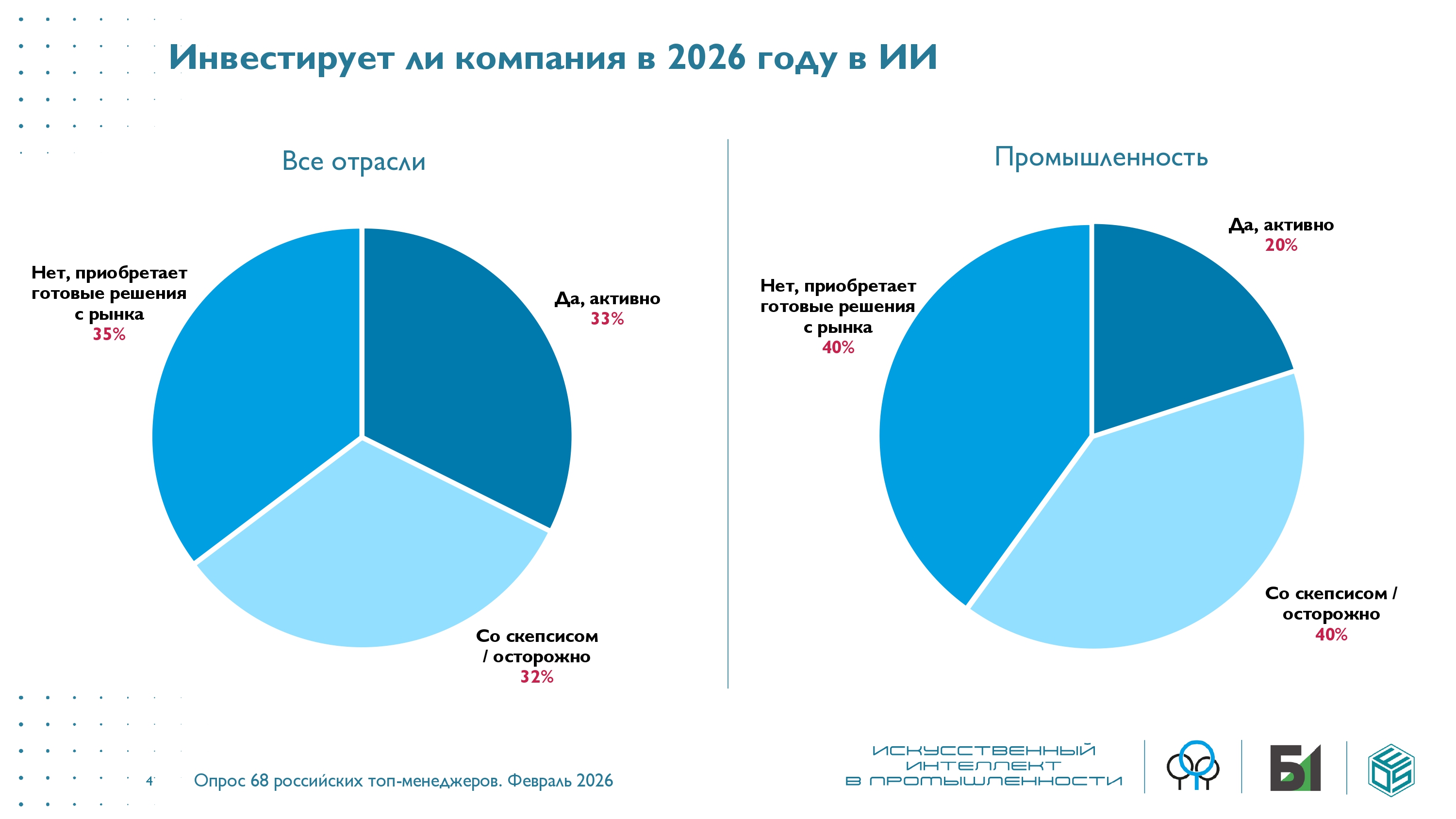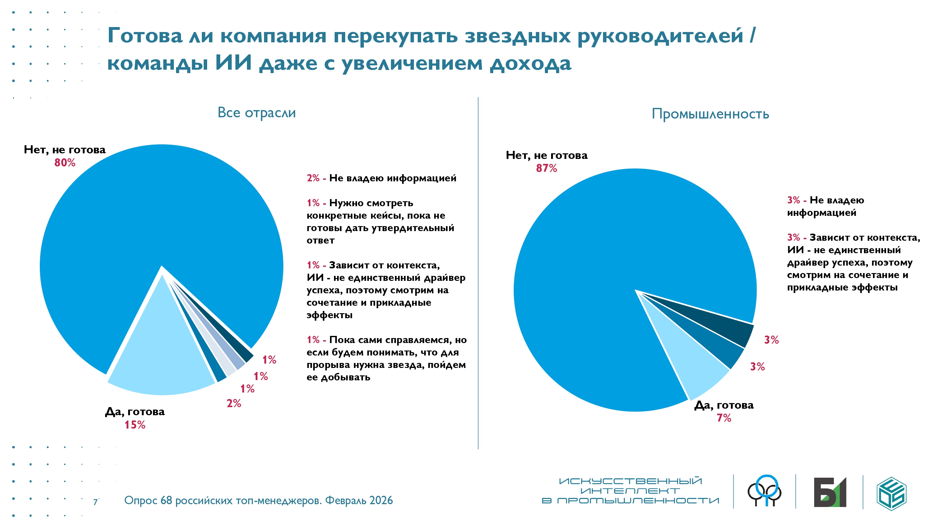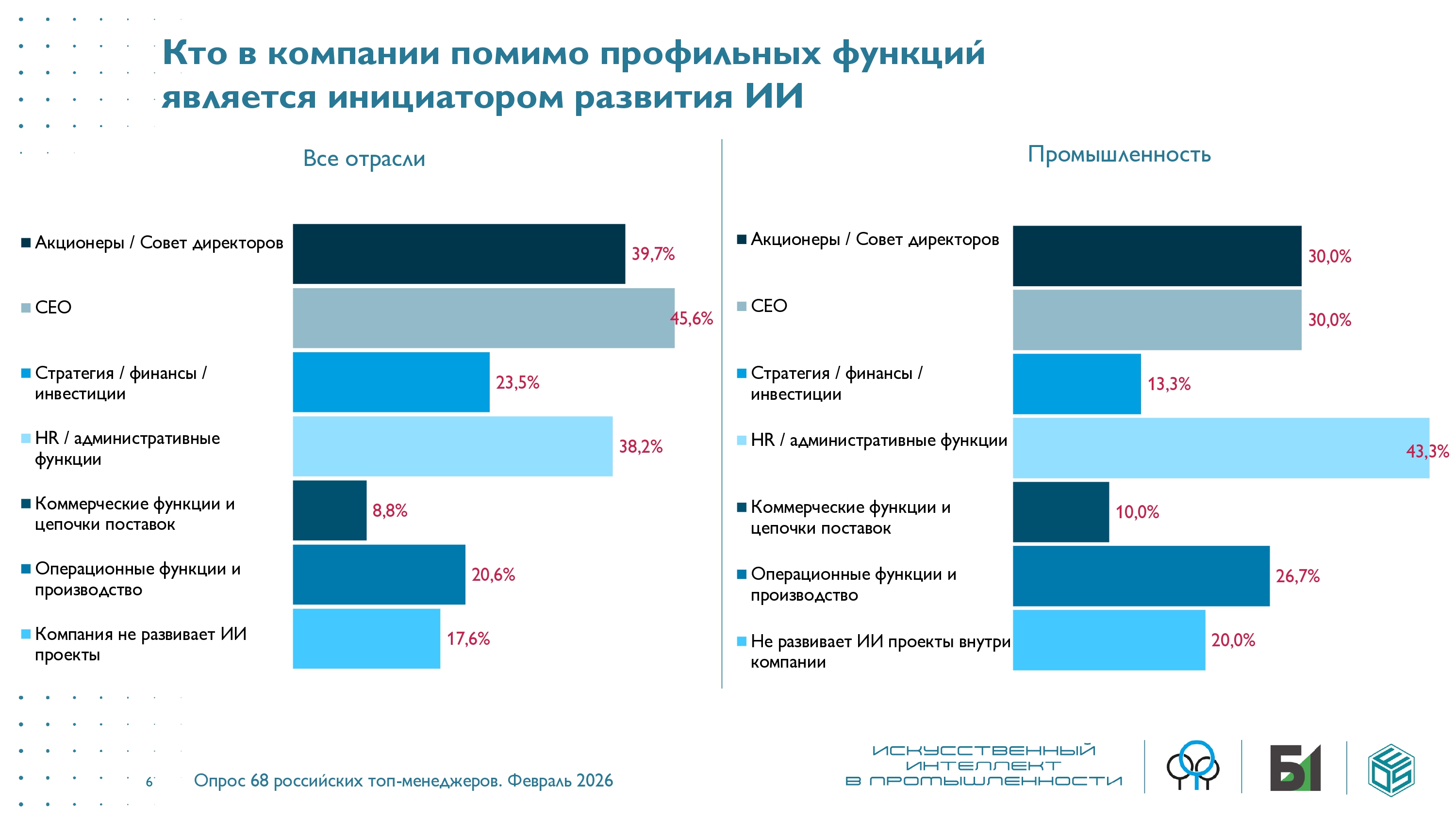 Только 15% компаний готовы перекупать звездных руководителей или целые ИИ-команды. Рынок демонстрирует осторожное отношение к инвестициям в искусственный интеллект: только 33% активно вкладываются в искусственный интеллект. 35% компаний отметили, что покупают готовые решения, а 32% со скепсисом наблюдает за развитием технологий. При этом инициаторами развития ИИ-технологий (помимо профильных функций) чаще выступают акционеры, CEO и HR.