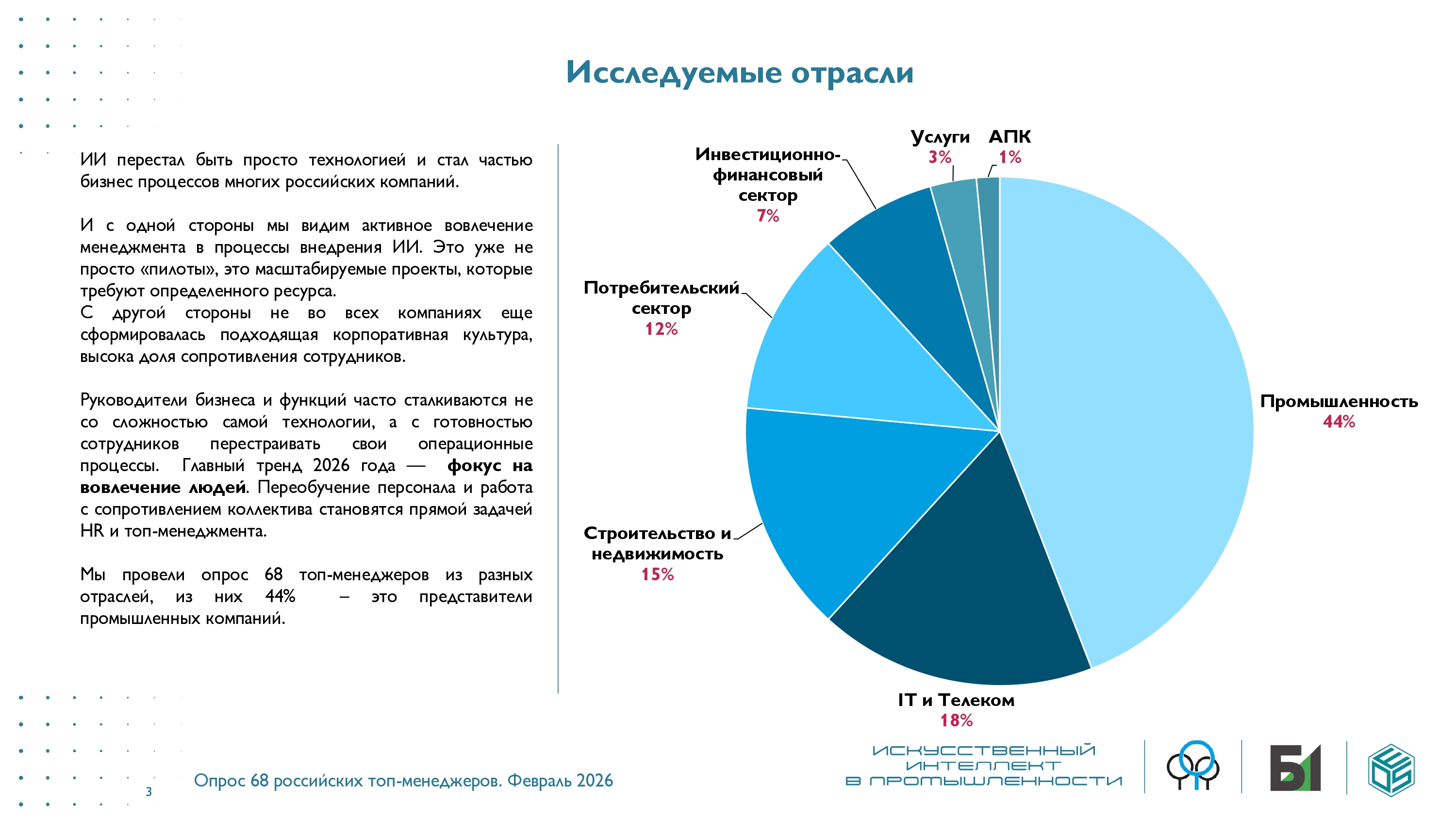 Опрос, в котором приняли участие топ-менеджеры из 68 компаний из разных отраслей, был представлен 17 февраля в рамках дискуссии о внедрении искусственного интеллекта в промышленности.